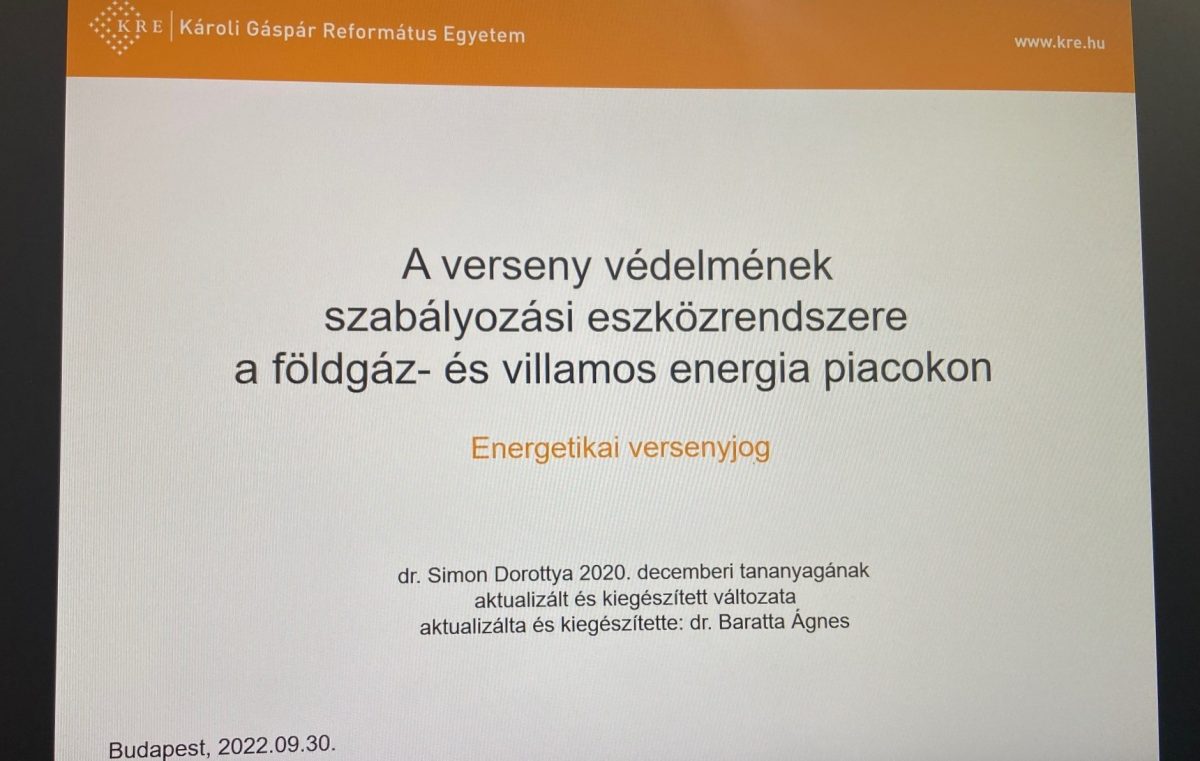 Nagy örömömre szolgált, hogy idén is felkérést kaptam a Károli Gáspár Református Egyetem Állam- és Jogtudományi Karától, hogy az Energetikai és természeti erőforrások szakjogász posztgraduális képzésben részt vevő hallgatók számára előadást tartsak a verseny védelmének szabályozási eszközrendszeréről a földgáz- és villamos energia piacokon.